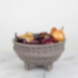 Vackert formad skål i papier maché, där grundmaterialet är återvunnen bomull. Skålen tillverkas för hand och blir med sin ojämna struktur en dekorativ accessoar, som är fin med eller utan frukt.