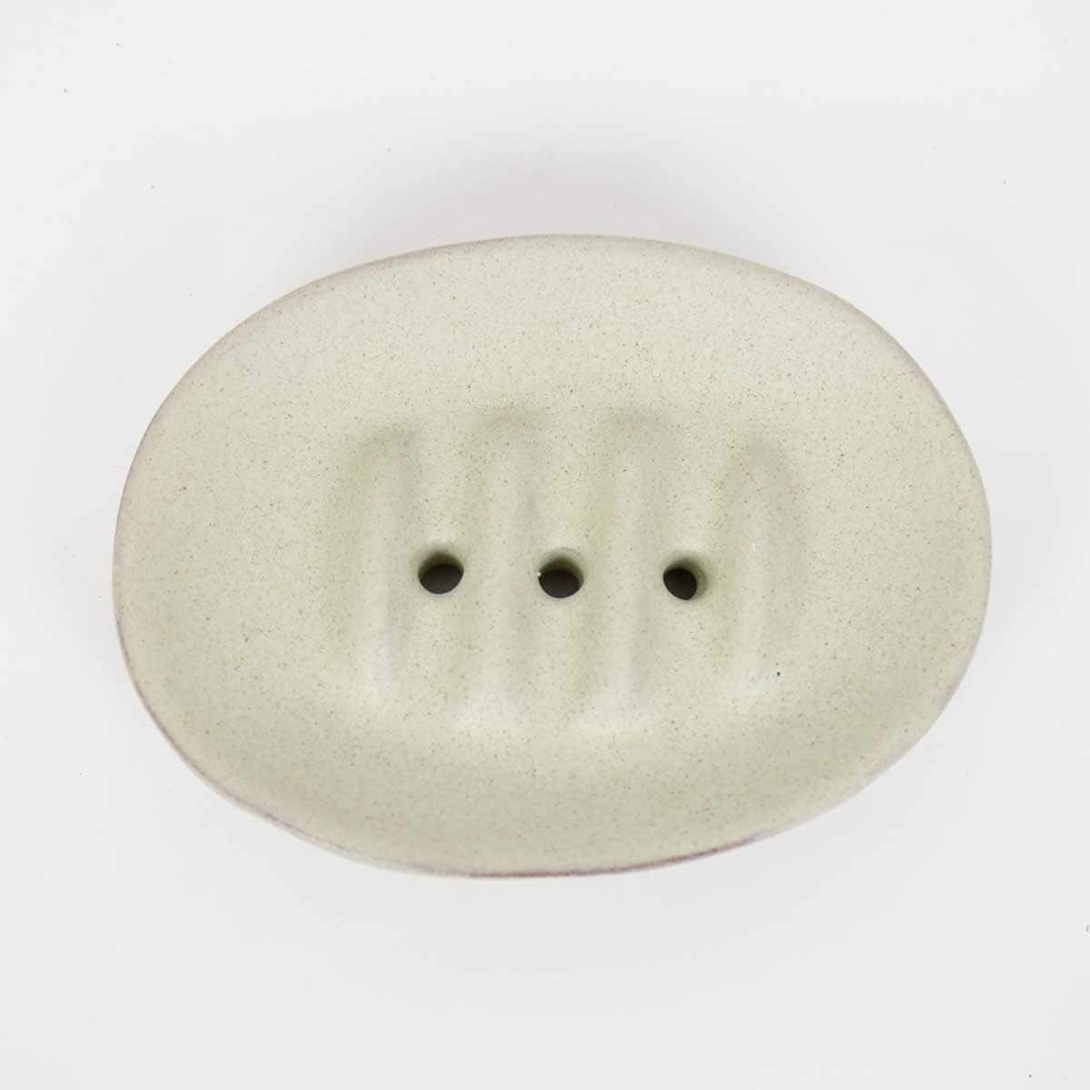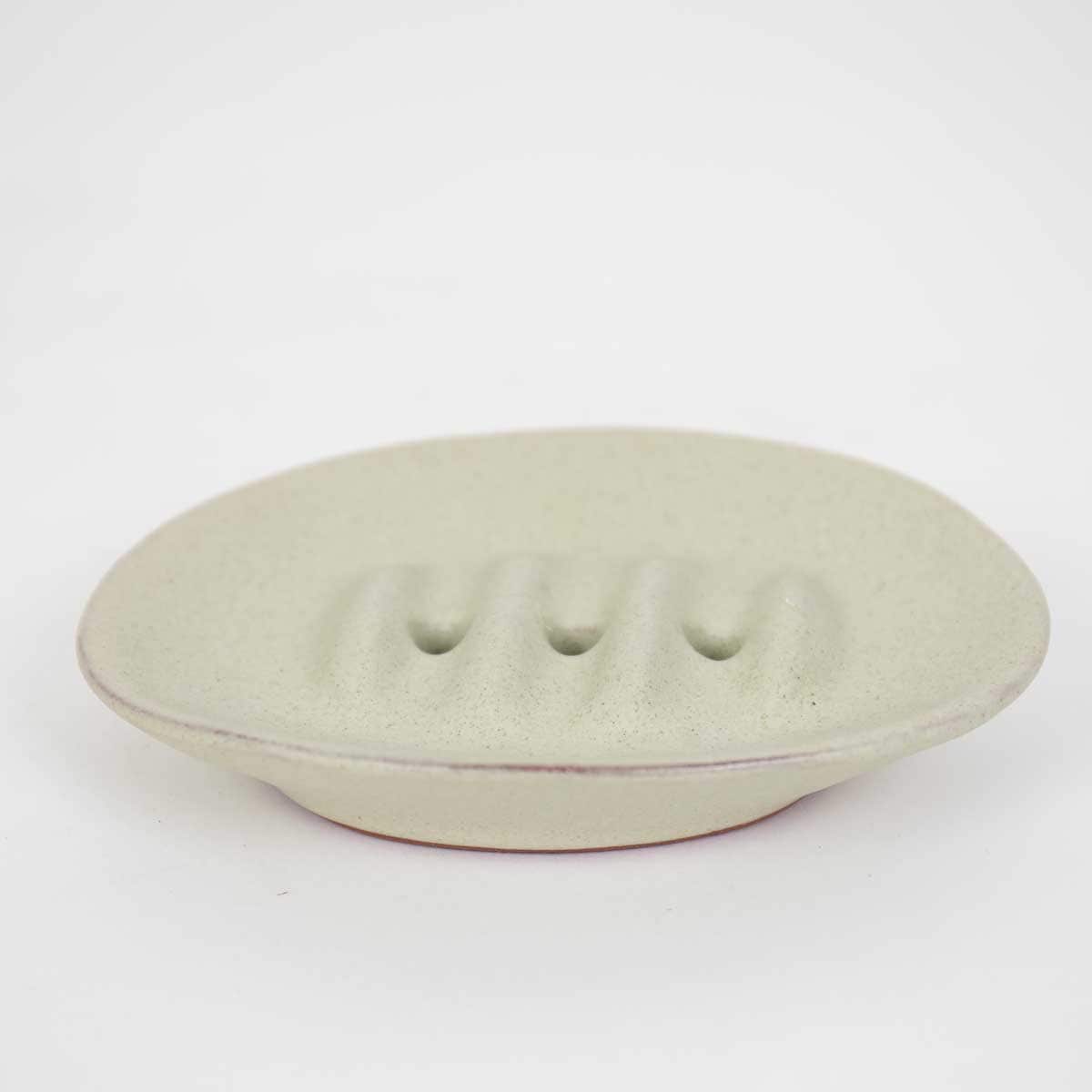 Fin handgjord tvålkopp med grå/beige glasyr.