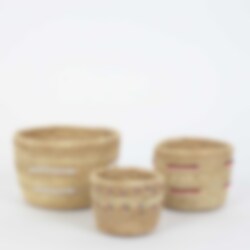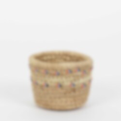 The tightly hand-woven palm leaf baskets are made by women from the nomadic Ngurunit people in Kenya. The baskets are characterized by the small, sparsely placed glass beads. Originally, these baskets were used for milking camels.