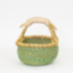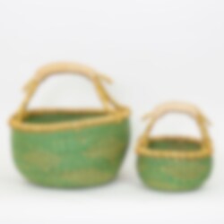 This tiny "Bolga basket" is the baby variant of the traditional picnic basket. This one too has a leather handle made from goat.