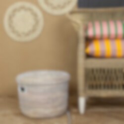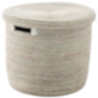 Beautifully shaped baskets with lids, handmade by women in rural Senegal. Natural material is woven with thin colored plastic strips.