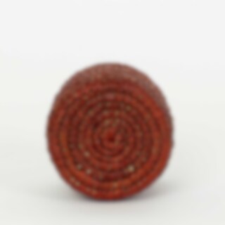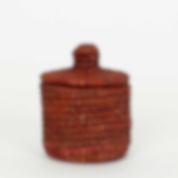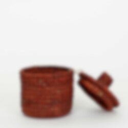 A small, colorful lidded basket, perfect for storing tiny items like rings or small coins. The basket is handwoven from dyed palm leaves.