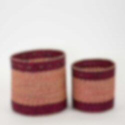 A sturdy, cylindrical basket, handwoven in Bangladesh. This is a slightly smaller basket, perfect for storing small bathroom items, for example.