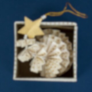 A nice little hanging Christmas ornament made of handmade cotton paper. Comes in a dotted paper box.