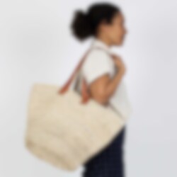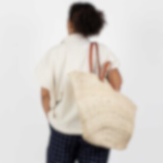 The material here is banana fiber, made from the leaves of banana trees. They are tough and durable, making them excellent for basket making. The color is the fiber's natural one and may therefore vary slightly... we would describe it as light beige with a marbled effect.