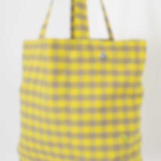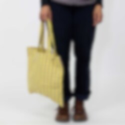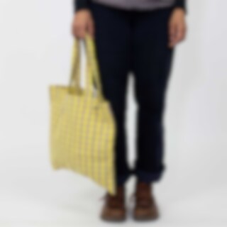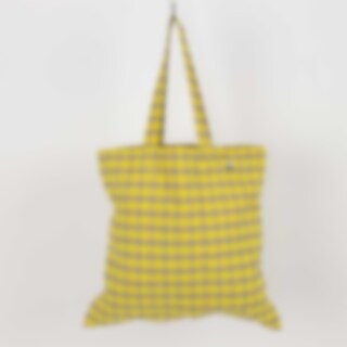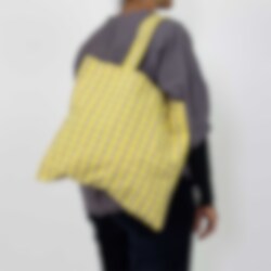 Modell bär en rutig tygpåse i gult och grått - Fair Trade