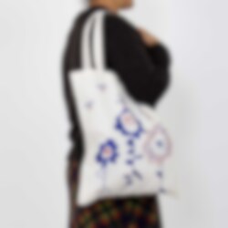 A bag in unbleached cotton with fine hand embroidery on the front. The hand-embroidered textiles are manufactured in the Khulna region of Bangladesh. The artisans is part of a Fair Trade organization, which creates important jobs in the countryside.
