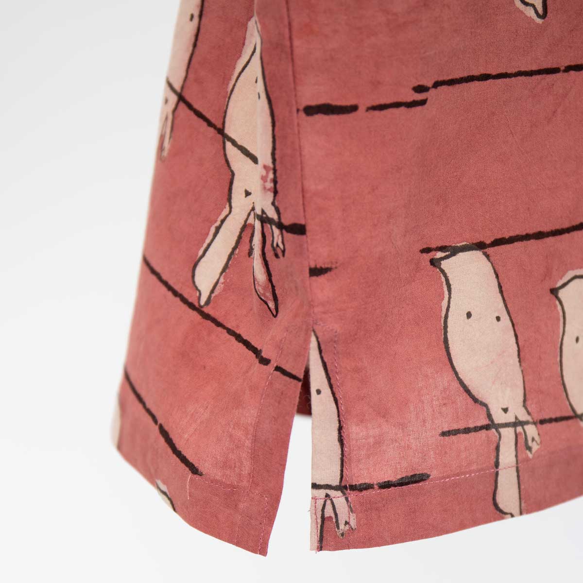 The fabric is plant-dyed and is part of a collection of textiles from India, where traditional craft techniques such as block printing and wax batik are used, sometimes both on the same fabric.