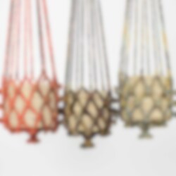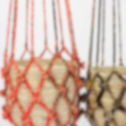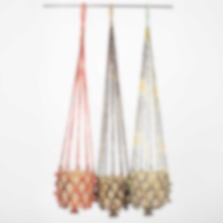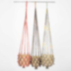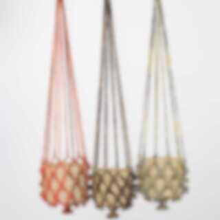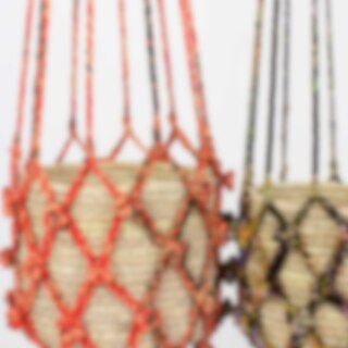 En handflätad ampel tillverkad av återvunna Sarityger. Alla amplar är därför olika och varierar i färg. Produktionen skapar angelägna arbetstillfällen för kvinnor på landsbygden i Bangladesh.
