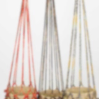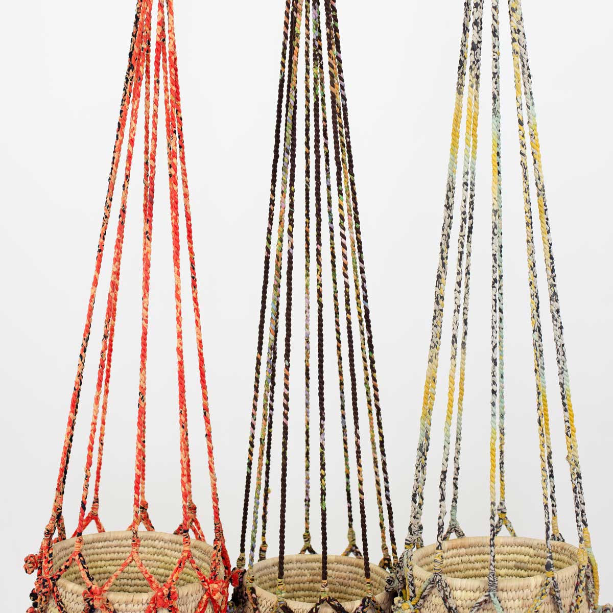 A hand-braided hanging planter made from recycled sari fabrics. Each planter is unique and varies in color. The production creates much-needed job opportunities for women in rural Bangladesh.