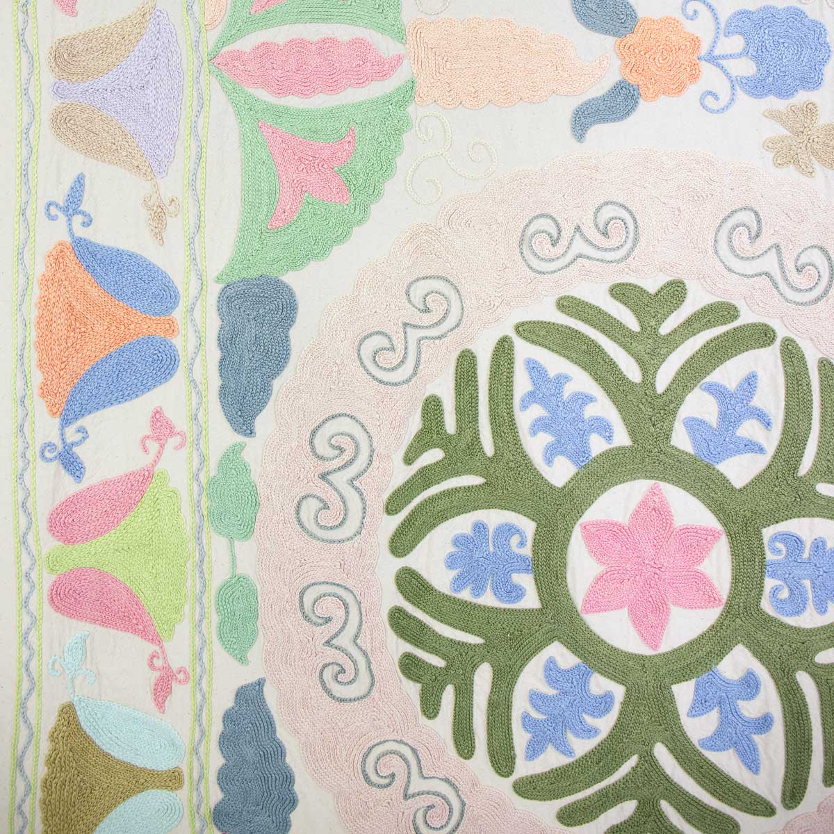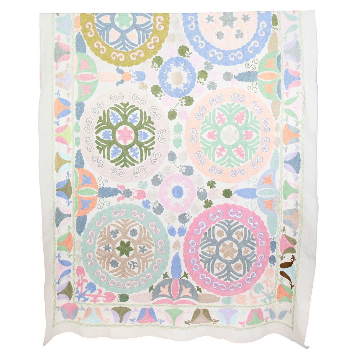 Ett stort handbroderat tyg med en storlek som passar till överkast för en enkelsäng. Tygstycket är fodrat med ett vitt bomullstyg på baksidan.