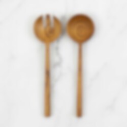 The salad servers are made from leftover materials from teak production. Roots and otherwise unusable wood have been repurposed to make it possible to cultivate teak again.