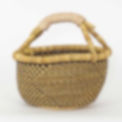 This tiny "Bolga basket" is the baby variant of the traditional picnic basket. This one too has a leather handle made from goat.
