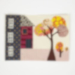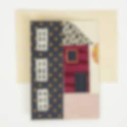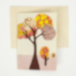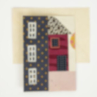 Double-folded card and envelope made of handmade Lokta paper. The inside of the card is white. The patterned paper details are cut-out patterned paper.
