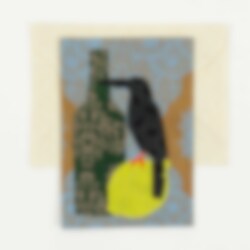 A double-folded card with an envelope made of handmade Lokta paper. The motif is made with a collage technique using different patterned papers. The inside of the card is white.
