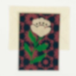 A double-folded card with an envelope made of handmade Lokta paper. The motif is made with a collage technique using different patterned papers. The inside of the card is white.