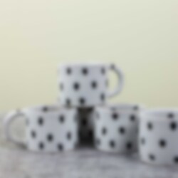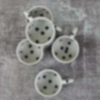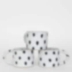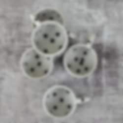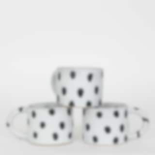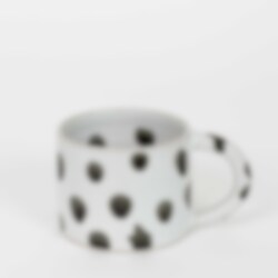 A nice black dotted coffee cup in a matte light grey glaze with glossy black spots. Every cup is glazed individually, therefor the dots occur differently from cup to cup.
