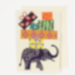 A double-folded card with an envelope made of handmade Lokta paper. The motif is made with a collage technique using different patterned papers. The inside of the card is white.