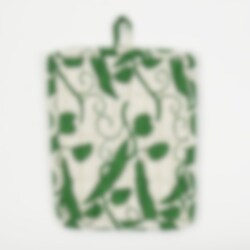 A potholder with a practical rectangular shape. It is made of hand-printed cotton and an insulating polyester filling, which protects the hands when cooking.