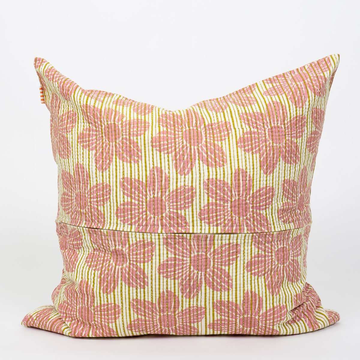 The pattern is printed using a hand-carved wooden block and then hand-quilted to create a soft, beautiful texture. Covering an entire surface with stitching in this way is called "Kantha" — an ancient technique originally used to beautifully reinforce and repair worn textiles.