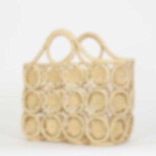 This delicate beauty is hand-woven from the sustainable material Raffia, which comes from part of the Raffia palm's leaves. Note the technique... small hand-woven circles have been joined together to form a cylinder-shaped basket.
