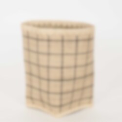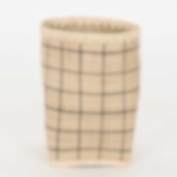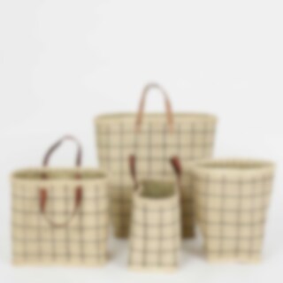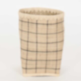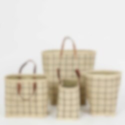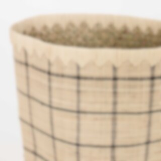 En papperskorg i samma hållbara material som i våra väskor. Det rutiga korgmaterialet vävs för hand av raffiafiber. Raffia (Raphia) består av cirka tjugo palmarter som växer i tropiska regioner i Afrika. Fibern produceras från membranet på undersidan av varje enskilt blad. Denna fiber kan färgas och flätas eller vävas till produkter.