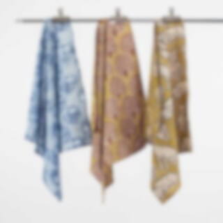 Tyget tillhör en serie som tillverkats med hantverkstekniker som blocktryck och vaxbatik, samt infärgning med växtfärger. Tyget kan torrfälla.