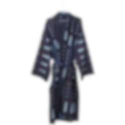 Modellen på bilden är 162 cm lång och bär en kimono storlek S/M. Kimonon är infärgad med den naturliga färgen Indigo. Den kan därför torrfälla och bör tvättas före användning.