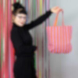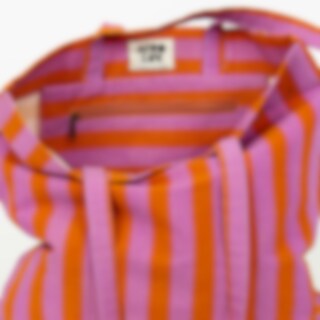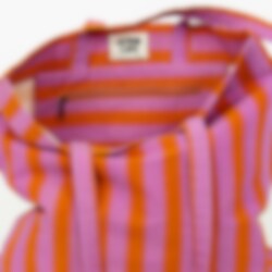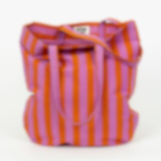 Randaväskan är tillverkad i en stadig bomullskvalitet. Mönstret är handtryckt med vertikala ränder på ena sidan och horisontella på den andra. Väskan har även en innerficka med blixtlås.