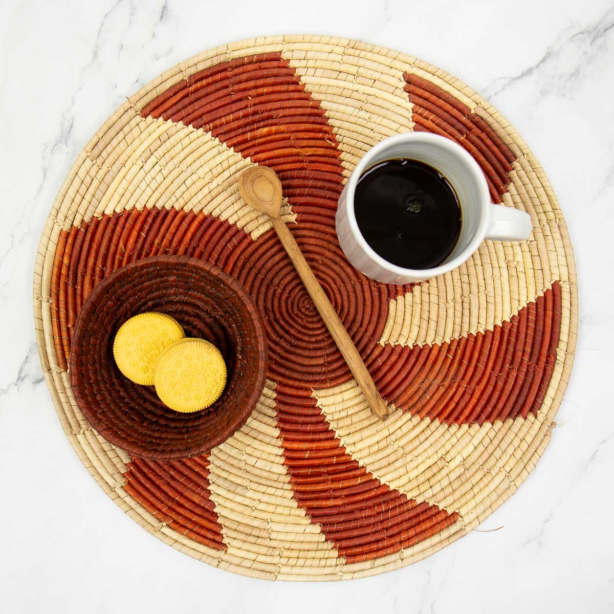 Bordstabletter och tallriksunderlägg är praktiskt och dekorativt när du vill skydda en vacker bordsskiva och inte vill använda en hel duk. Våra randiga bordstabletter tillverkas av Mayafolket i Guatemala av samma skickliga vävare som gör våra randiga kuddfodral. De rutiga underläggen är från afrikanska Madagaskar, där man väver med palmbladsmaterialet Raffia. De runda bordstabletterna är lite krafigare och fungerar även som ett stort grytunderlägg.