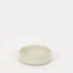 Ett litet handdrejat fat i en gråvit blank glasyr med små svarta oregelbundna fläckar. Fatet kan diskas i diskmaskin.