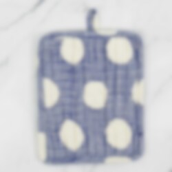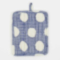En grytlapp med en praktisk rektangulär form. Den är tillverkad av handtryckt bomull och en isolerande polyesterfyllning, som skyddar händerna vid matlagning.