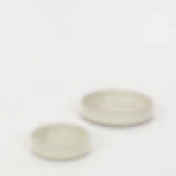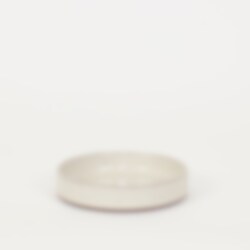 Ett litet handdrejat fat i en gråvit blank glasyr med små svarta oregelbundna fläckar. Fatet kan diskas i diskmaskin.
