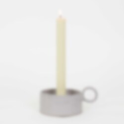 En ljusgrå ljusstake i keramik med ett tänt ljus i