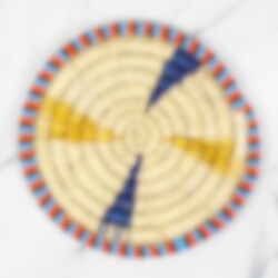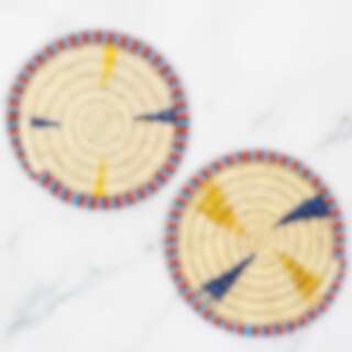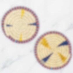 Grytunderlägg i flätade palmblad och pärlor i blått, orange och svart. Fair trade från Nairobi