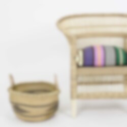 En Bolga korg med handtag står bredvid en rottingfåtölj med färgglad kudde