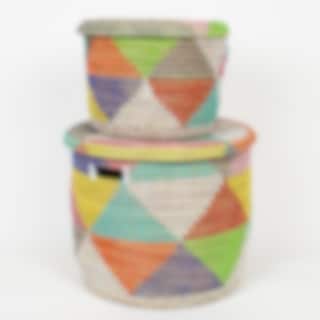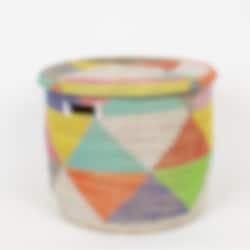 Korgen är en del av en serie vackert formade korgar med lock, som är handgjorda av kvinnor på landsbygden i Senegal. Det långa gräset handflätas med hjälp av tunna färgade plastremsor.