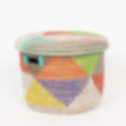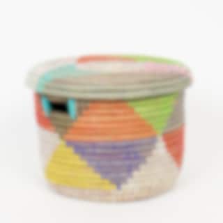 Korgen är en del av en serie vackert formade korgar med lock, som är handgjorda av kvinnor på landsbygden i Senegal. Det långa gräset handflätas med hjälp av tunna färgade plastremsor.