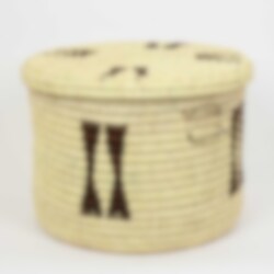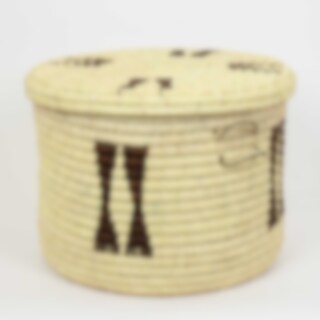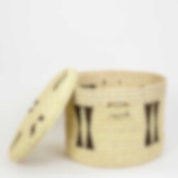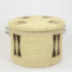 En dekorativ korg med lock, användbar till förvaring av tidningar, leksaker mm. Korgarna tillverkas av Turkanafolket i nordvästra Kenya där materialet, som används, är palmblad från palmen Doum. Korgarna är mycket välgjorda och stadiga.