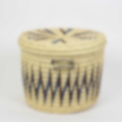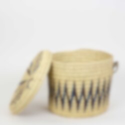 En dekorativ förvaringskorg med lock, som tillverkats av Turkanafolket i nordvästra Kenya. Materialet som används är palmblad från palmen Doum. Korgarna är mycket välgjorda och stadiga.
