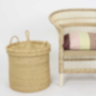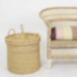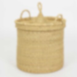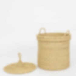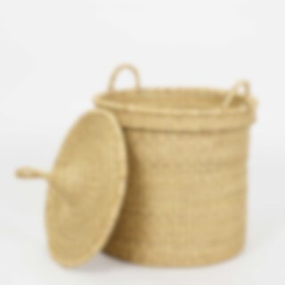 En stor naturfärgadkorg med handtag och ett lock som ligger bredvid