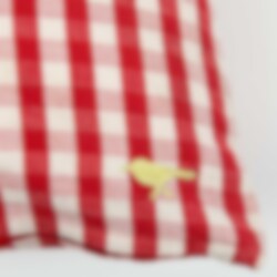 De klassiskt rutiga textilierna tillverkas i en organisation, som är medlem i WFTO, World Fair Trade Organization, och som enbart använder ekologisk bomull i sin produktion. Dess signum är den lilla handbroderade gula fågeln.