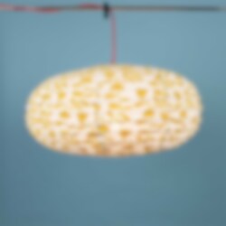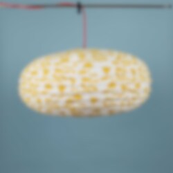 En lampskärm i bomull med fin oval form. Den ger ett mjukt ljus och kan användas var som helst i hemmet. Mönstren är tryckta med handsnidade träblock på bomull.
