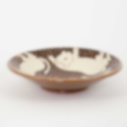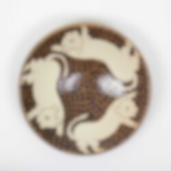Ett vackert och unikt keramikfat som verkligen gör intryck. Fatet har en varm brun botten med lekfulla blåa prickar och är dekorerat med vackert målade vita lejon. Perfekt som uppläggningsfat, för frukt eller som en dekorativ blickfångare i hemmet. Varje fat är handgjort och har sin egen personlighet.