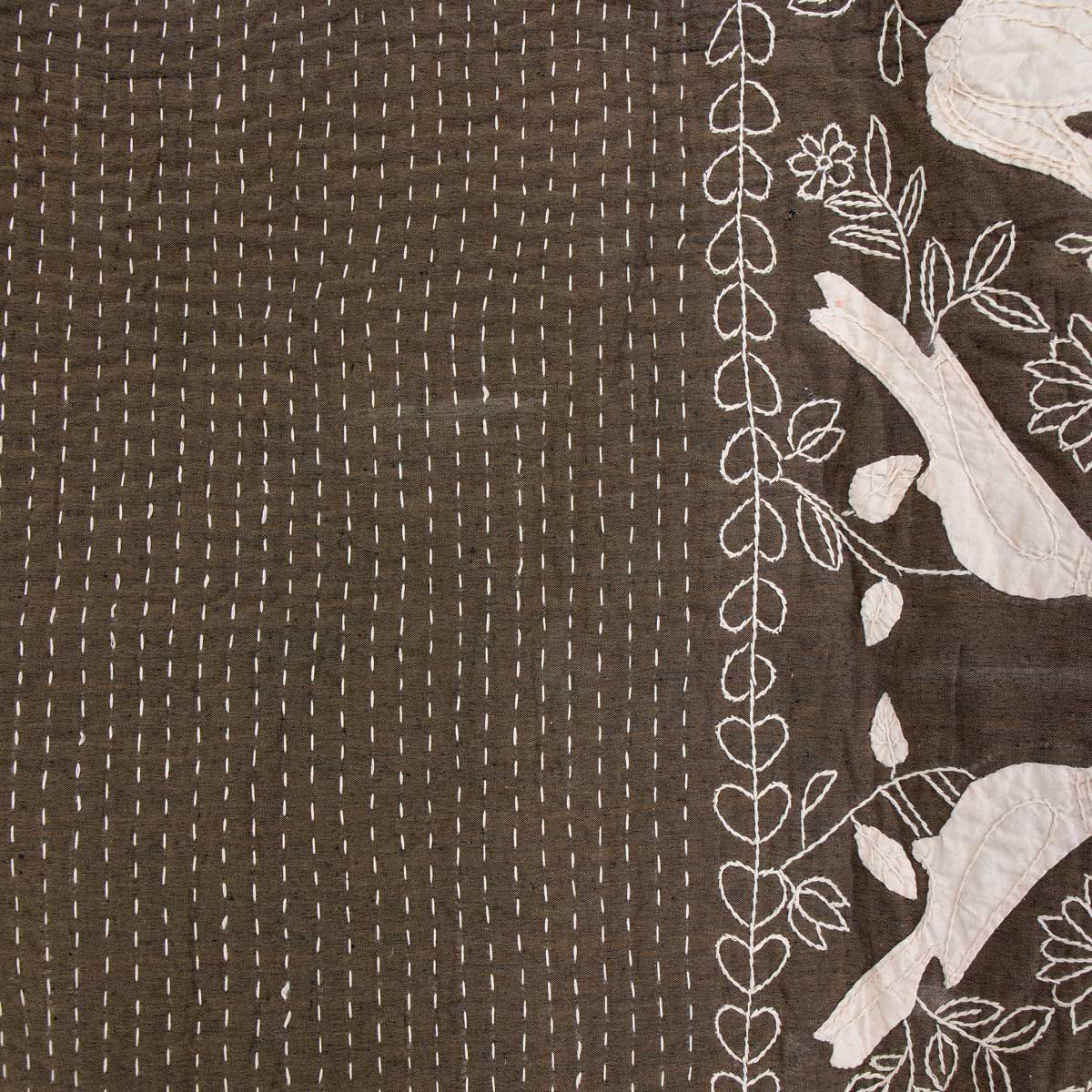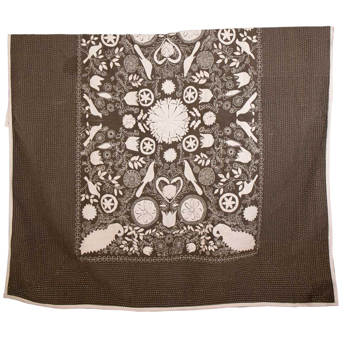 Överkastet har ett utsökt hantverk. De sirligt utklippta tygbitarna har sytts fast med små nätta stygn. Hela överkastet är handquiltat.