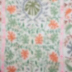 De stora bonaderna är handbroderade av kvinnor i Rajasthan. Kvinnorna är egentligen specialiserade på att brodera de traditionella skor, som är typiska för Rajasthan. Kvinnorna sitter i grupp och broderar på samma tygstycke. Färgkombinationerna är kvinnornas egna.
