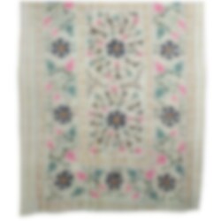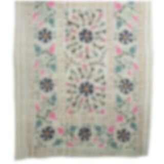 Ett stort handbroderat tyg med en storlek som passar till överkast för en enkelsäng. Tygstycket är är vändbart.