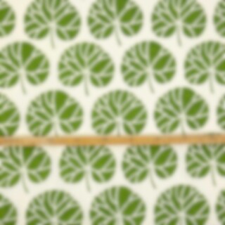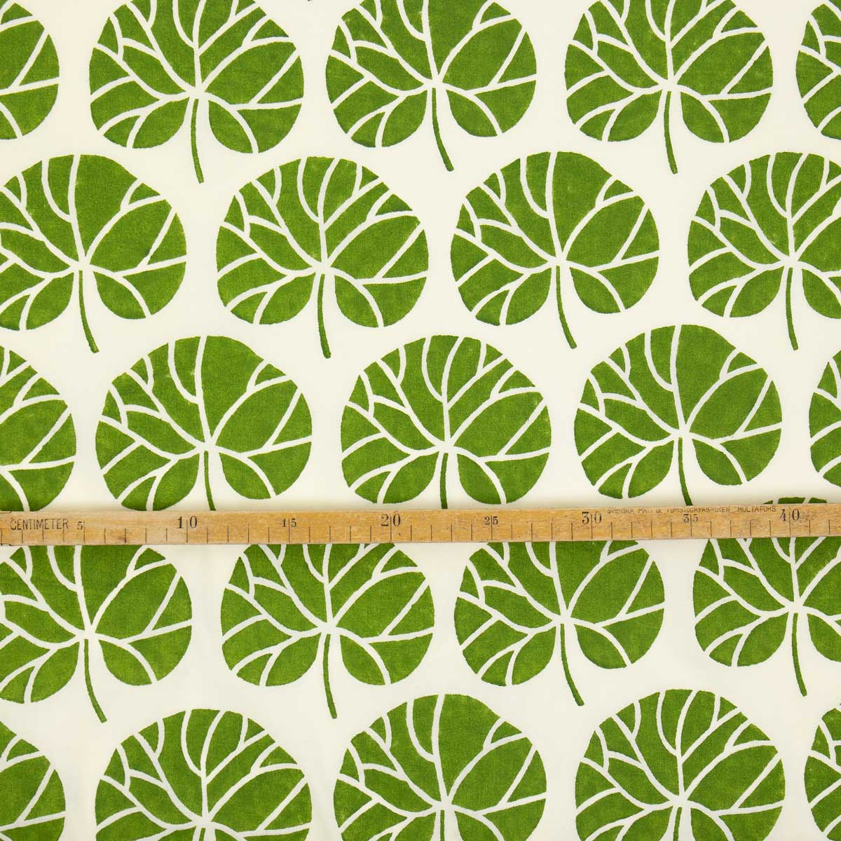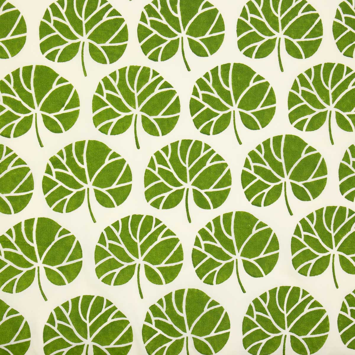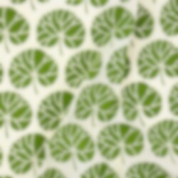 En tunn fin bomullskvalitet med mönster tryckt med handsnidade träblock, s k blocktryck eller block print. Produktionen är småskalig och helt hantverksbaserad.