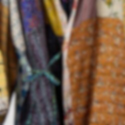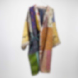 En färgglad kimono med fickor och skärp, gjord av sidentyg. Alla Kimono är olika men snarlik den på bilden.