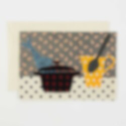 Ett lite större dubbelvikt kort med kuvert av handgjort Loktapapper. Motivet är gjort med collageteknik där olika mönstrade papper använts. Kortets insida är vitt.